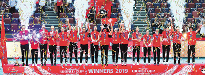 2019年9月29日,日本大阪,2019女排世界杯上,中国女排11连胜夺冠。图为中国女排队员在颁奖仪式上庆祝夺冠。