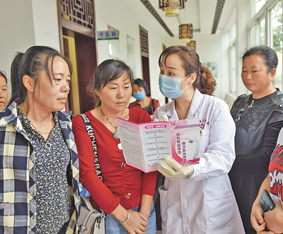 2021年,安徽省马鞍山市含山县昭关镇卫生院医务人员(右二)在给妇女科普“两癌”防治知识。