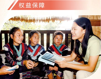 2003年,曾经的“春蕾女童”谢玉月(右一)回到家乡广西壮族自治区融水苗族自治县白云乡为小朋友授课。1989年,在全国妇联领导下,中国儿童少年基金会发起实施了致力于改善贫困家庭女童受教育状况的“春蕾计划”公益项目。