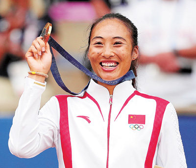 郑钦文在巴黎奥运会网球女子单打颁奖仪式上。2024年8月3日,在巴黎奥运会网球项目女单决赛中,中国选手郑钦文成为首个夺得奥运网球单打金牌的亚洲运动员。