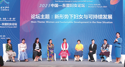 2021中国—东盟妇女论坛现场。全国妇联开展“凝聚女性力量 共建‘一带一路’”主题交流,连续主办“指尖上的丝绸之路——丝路妇女论坛”等活动。