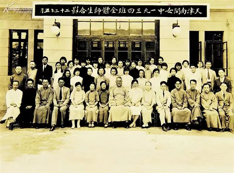 ▲南开女中1934班全体师生合影,前排左八为张伯苓,左七为梅美德