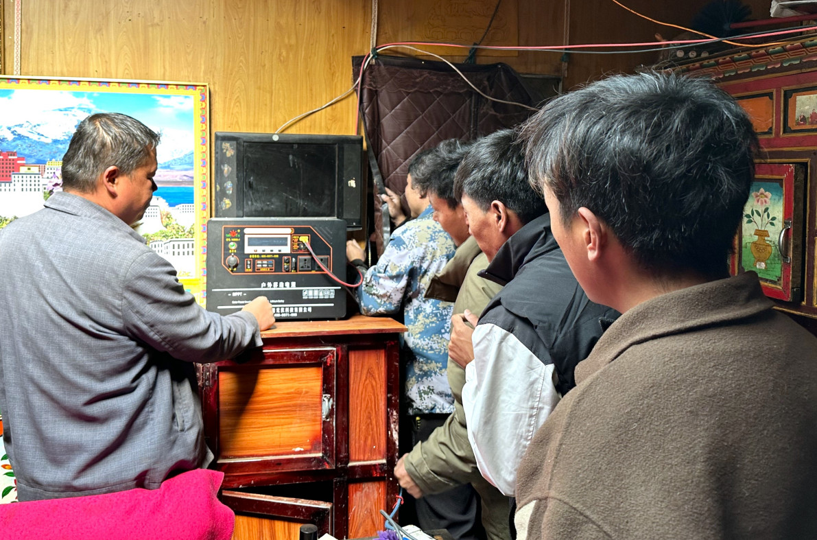 图为西藏公司驻村工作队员向萨旺村村民讲解光伏发电原理