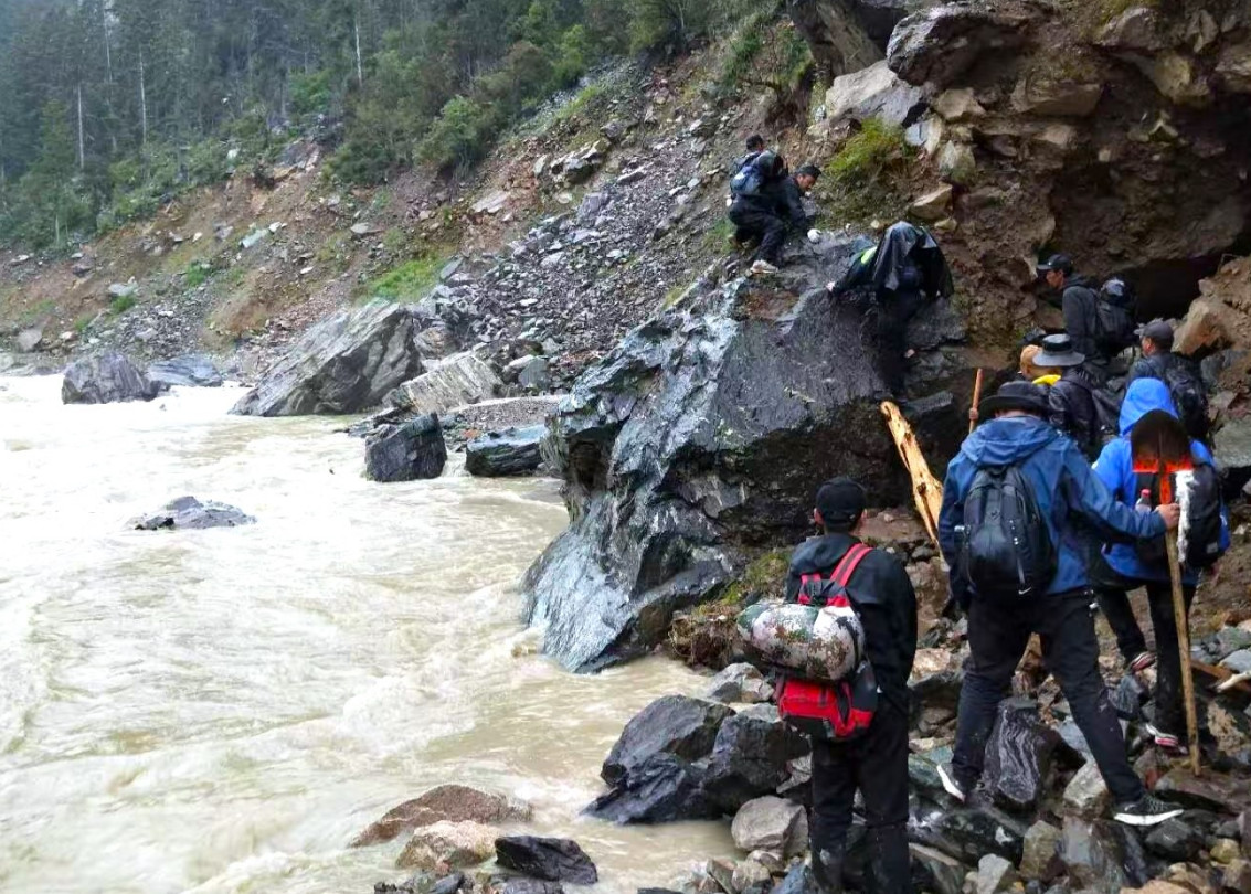 图为洪灾时西藏公司驻村队员翻山越岭为被困群众送去急救医疗物资