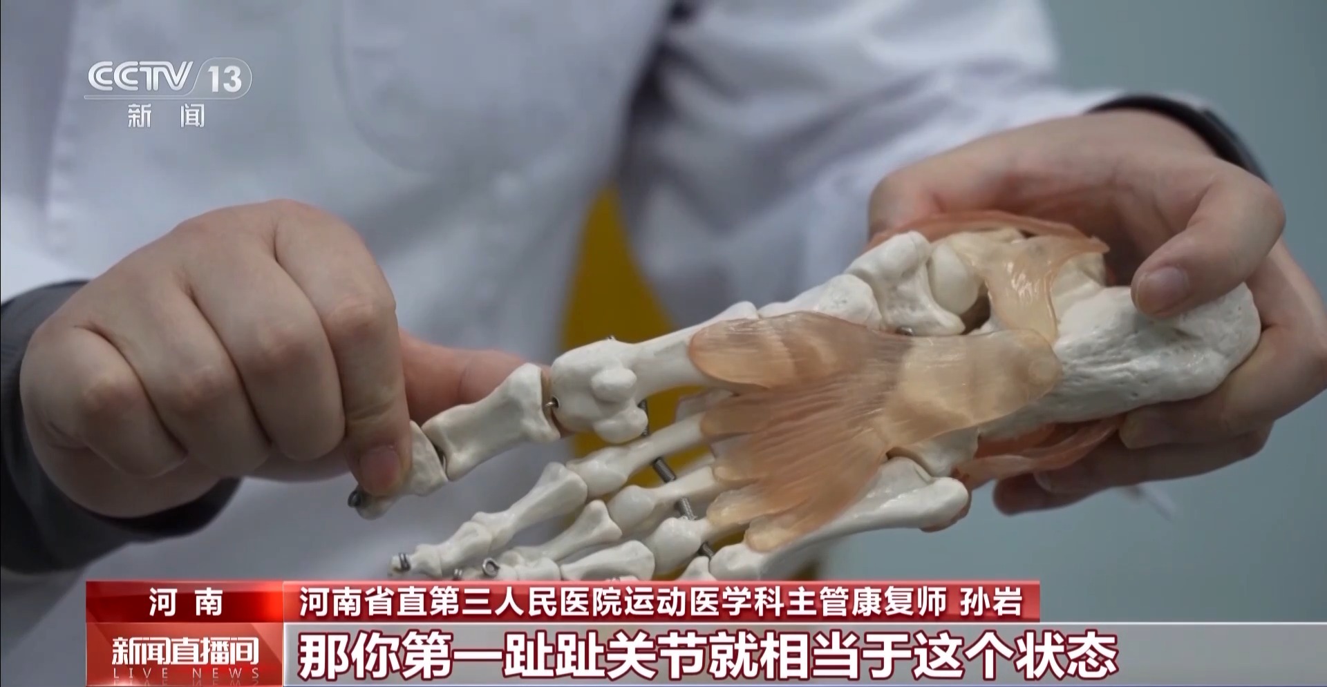 河南省直第三人民医院运动医学科主管康复师 孙岩:碳板鞋又叫竞速鞋,它的设计之初就是为了提高精英运动员的运动水平,所以设计一般像船形,两头比较高,中间比较厚,第一趾趾关节就相当于这个状态,足底筋膜始终处于一个拉长的状态,就会出现一些细小的裂缝,裂缝产生炎症,产生疼痛。