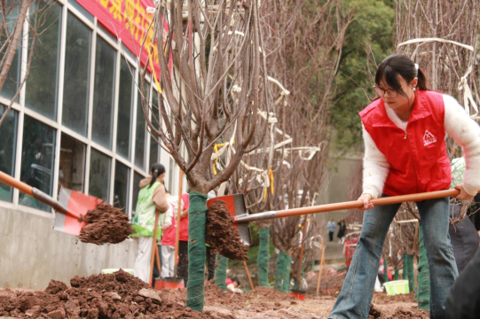 “一二三,一二三!”铁锹挥动,泥土翻起,一株株美人梅树苗种下。汗水滴落,与泥土的芬芳交织在一起,是劳动的味道,也是春天的味道。