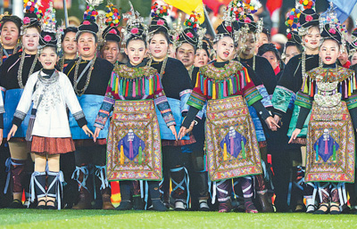来自三宝侗寨的女孩们在“村超村晚”上演唱侗族大歌。龙建睿摄(新华社发)