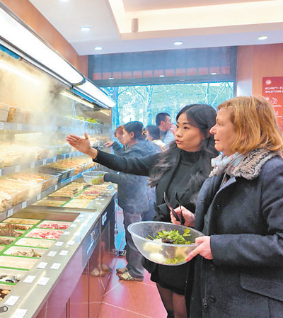 在柏林市中心,一家新开不久的“杨国福麻辣烫”店门口,当地人纳尔夫和几个好友推门而入。店内热气腾腾,空气中弥漫着浓郁的骨汤香气。在排队取餐的人群中,不乏像纳尔夫这样的外国朋友。他们拿起夹子和菜盆,熟练地自选食材(见图②,本报记者刘赫摄):藕片、菠菜、冻豆腐、宽粉、虾和牛肉卷……几分钟后,一碗香气四溢的麻辣烫被端上餐桌。
