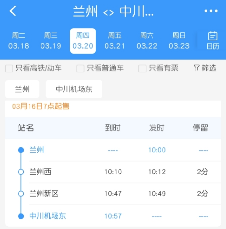 3月12日,从铁路12306客户端查询了解到,兰州中川机场环线车票从3月16日7时起售,该环线由兰州站起始,终点站为中川机场东站,不同车次分别途经兰州西、西固、兰州新区,全程50多分钟,车票种类包括一等座、二等座、无座票,票价19元起。届时,旅客乘坐环线到达中川机场东站后,“零换乘”进入T3航站楼。