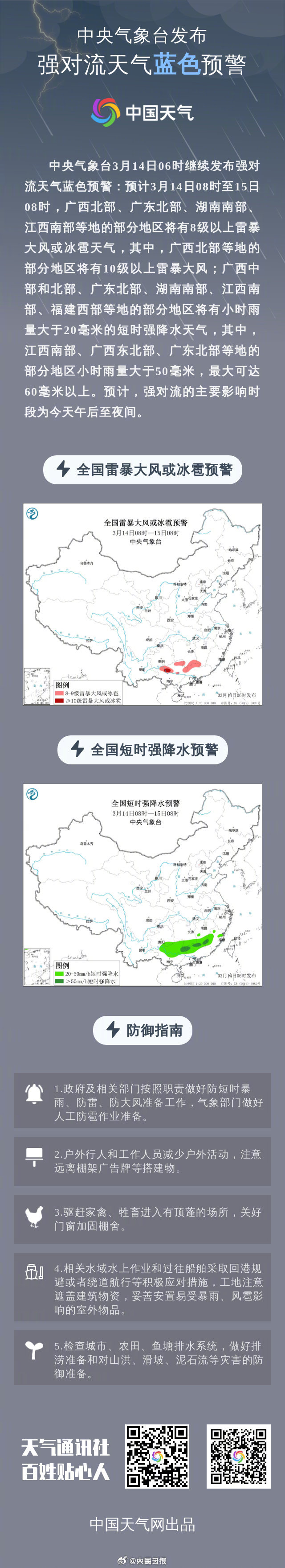 3月14日06时,中央气象台发布强对流天气蓝色预警、大风蓝色预警、暴雨蓝色预警。