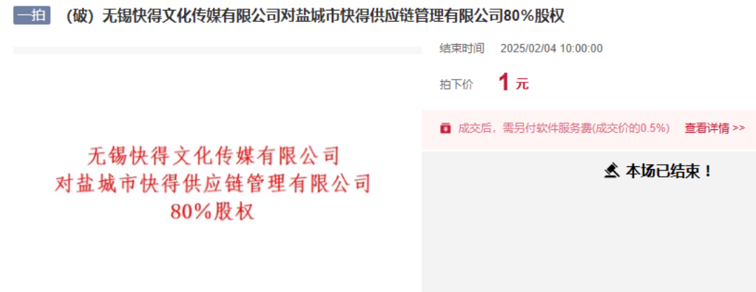 此次拍卖的标的物(买卖合同中所指的物体或商品)为盐城市快得供应链管理有限公司80%的股权,该拍品所有人为无锡快得文化传媒有限公司。拍卖活动于2025年2月3日10时开始,至2025年2月4日10时结束。