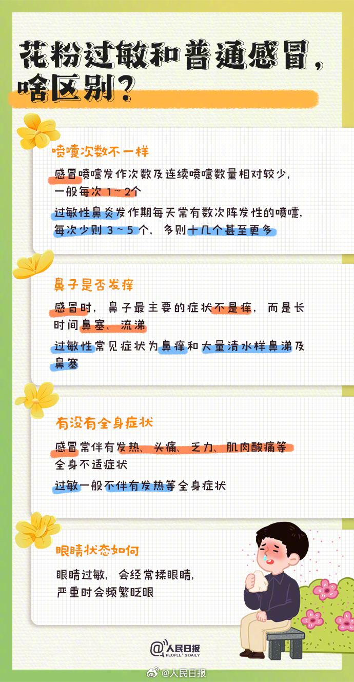 据往年数据,大部分地区花粉浓度约在3月中下旬达到高峰。鼻痒、鼻塞、打喷嚏、流鼻涕…引起花粉过敏的“元凶”是什么?花粉过敏和普通感冒,有啥区别?花粉过敏挂什么科?一组春季花粉过敏防护知识点↓↓转给家人和朋友!