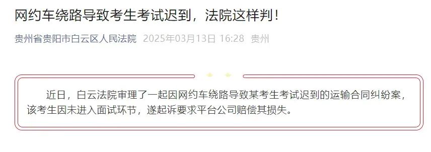 3月13日,贵阳市白云区人民法院公布此案,判决网约车平台公司赔偿考生2000元。