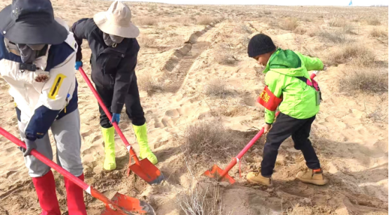 在治沙队伍中,一个身穿绿色外套的小男孩,引起了记者的注意,问了一下,他岁,来自中国香港,植树的伙伴们亲切地称他“小孩哥”。他说:“我和沙漠有个10年之约,今年是第二年,我要年年来这里植树,十年之后,我想亲眼见证这片沙漠长满梭梭的景象,一定美极了!”“小孩哥”今天认领的任务是回填,因为路途比较远,基地的另一位负责人“辉子哥”让他乘坐水车去工地,妈妈笑着说:“我把你卖给辉子哥了。”他说:“那我就不回去,在这些沙漠上多种些梭梭。”