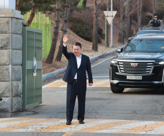 当地时间3月8日下午,韩国总统尹锡悦在位于韩国京畿道义王市的首尔拘留所前向支持者挥手。当天,尹锡悦在被逮捕52天后获释。韩国纽斯频通讯社 供图