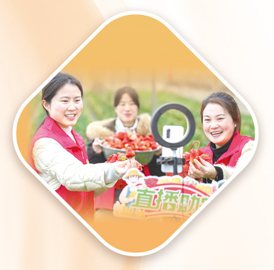 浙江省长兴县画溪街道,青年党员干部通过网络直播帮农户销售新鲜草莓。 |