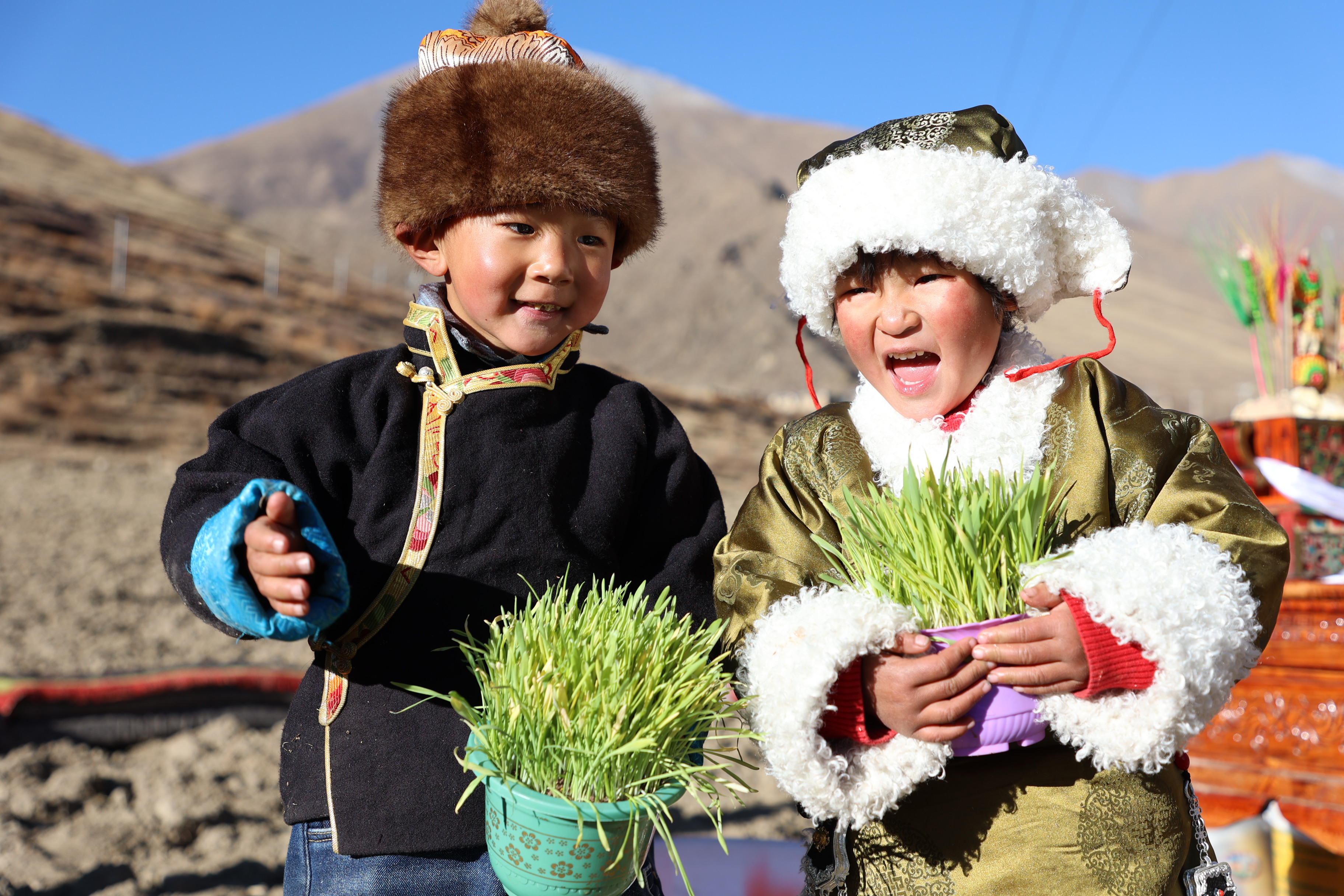 图为村里的小朋友洛桑顿珠和次吉永措手捧“洛皮”送祝福