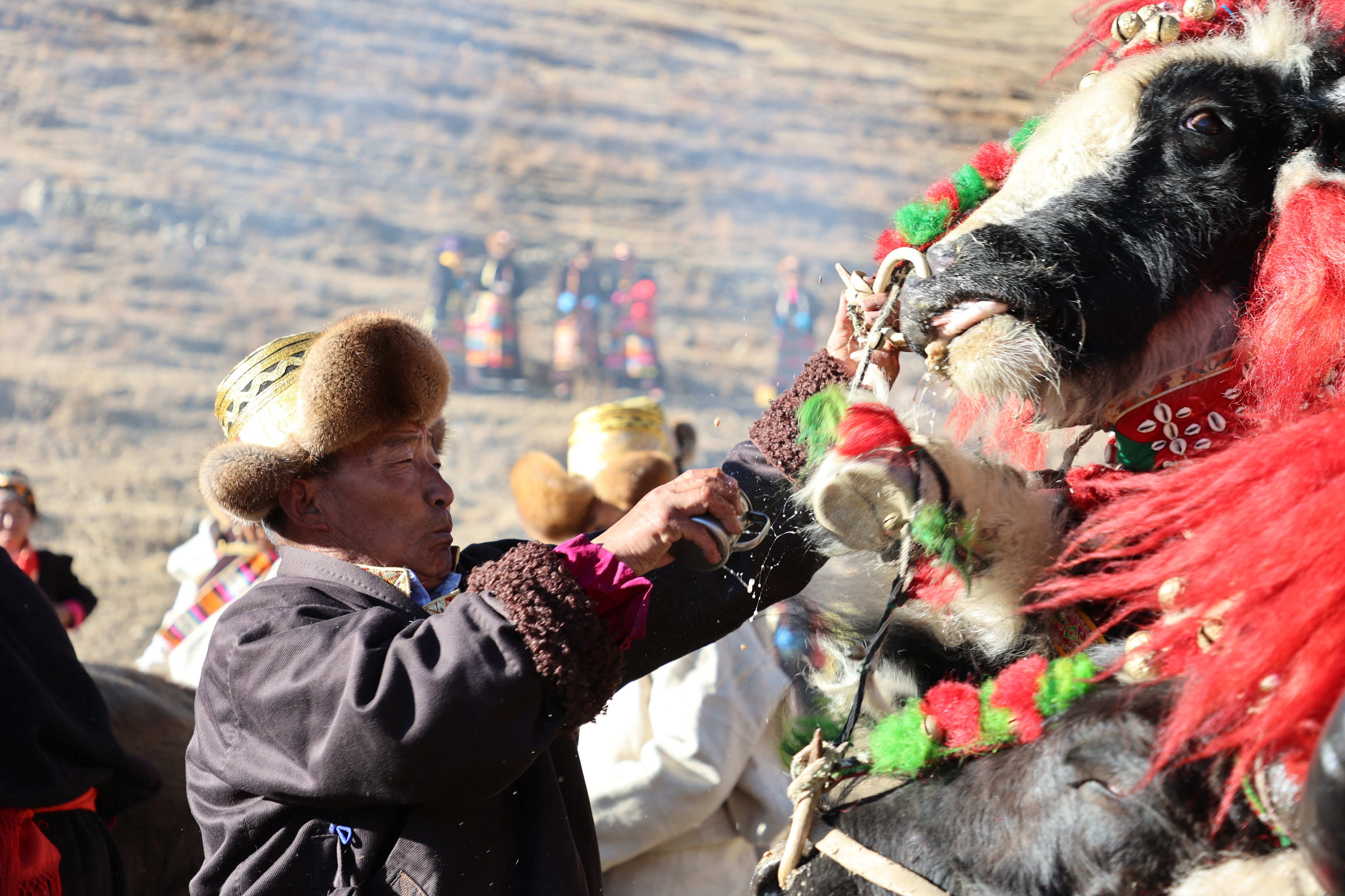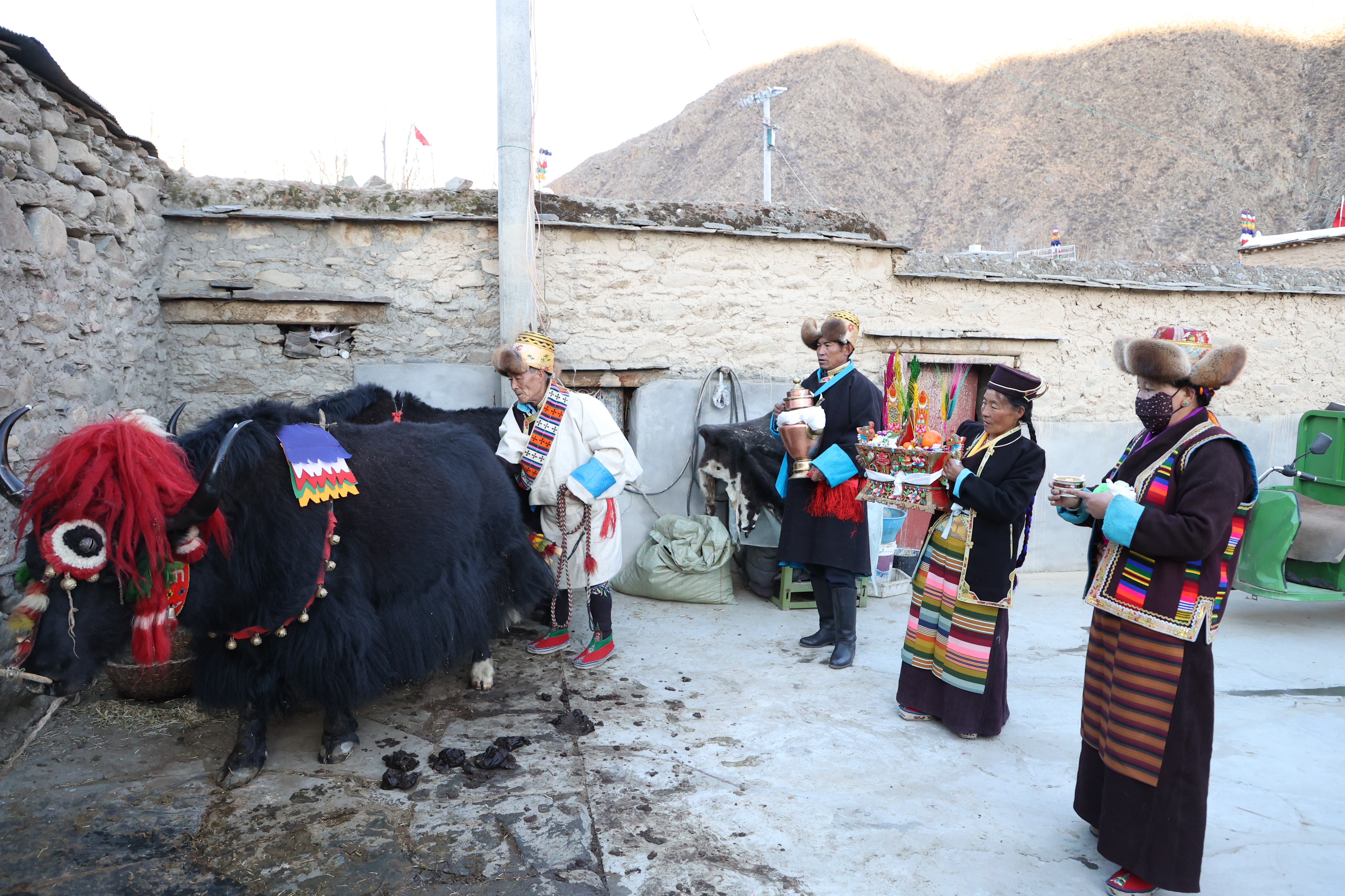 图为索朗边久老人一家正在为耕牛祈福一切顺利