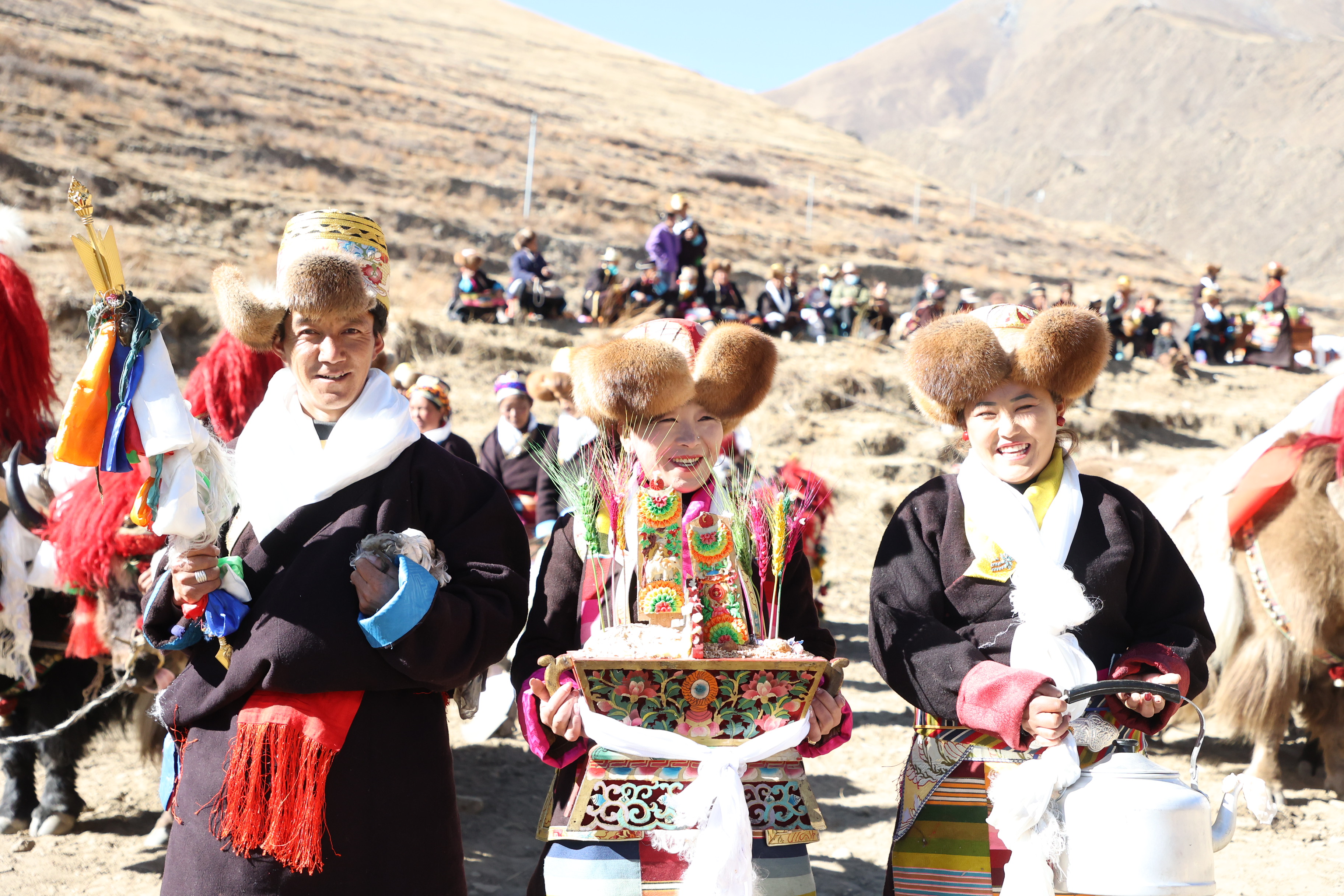 图为开耕仪式现场手捧切玛、青稞酒的年轻男女
