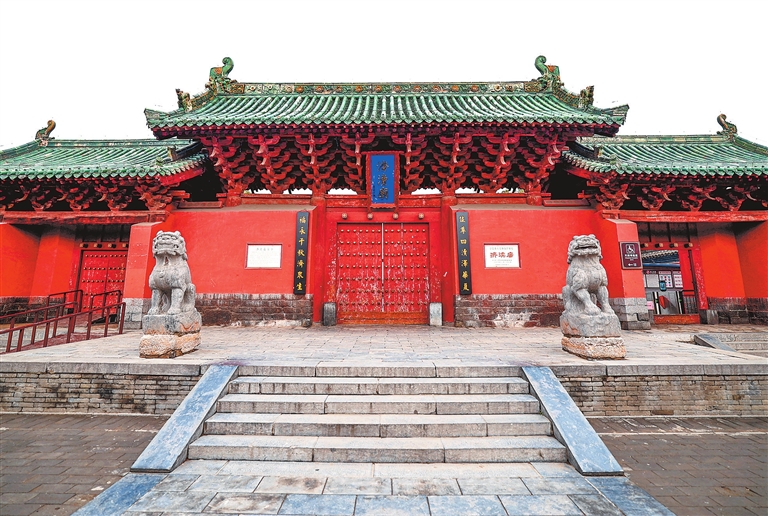 济渎庙大门两侧的楹联十分醒目:位尊四渎泽华夏;福永千秋济众生。