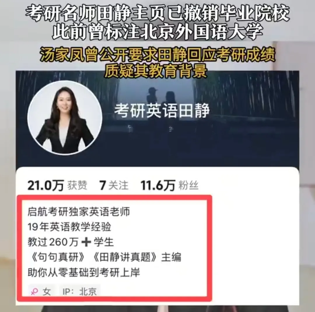 据荔枝新闻报道,近日,有网友发现“考研名师”田静已经在社交平台上悄悄删除了“北京外国语大学”的毕业院校信息。此前,田静曾因与其他考研名师同时参与“英语一”考试,过后又以“未答题仅看题”为由拒绝公布成绩,引发争议。风波尚未平息,又爆出这样看似心虚的举动,难免让舆论有所猜测。