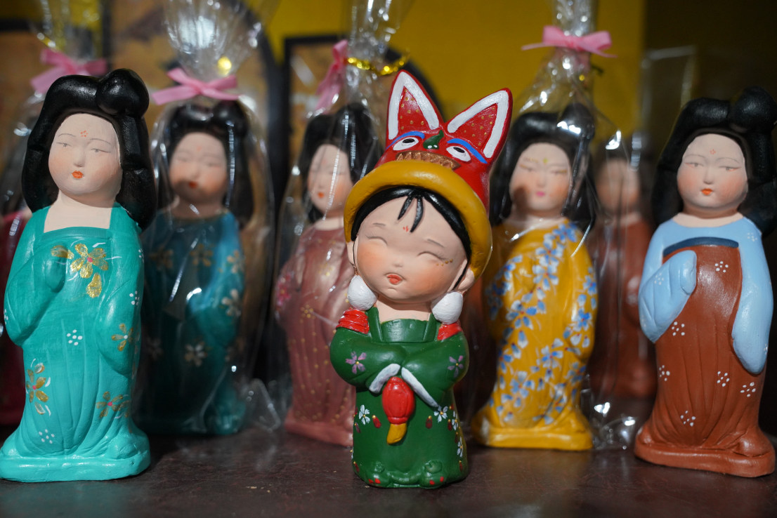 韩咪咪也大胆创新,独立设计创作出多款卡通造型文创兵马俑及仕女俑,还将刺绣老虎帽子、“泥叫叫”等非遗元素融入陶俑制作。搭配虎头帽的“唐妞”、顽皮噘嘴的“陕西楞娃”......让古老的陶俑多了几分俏皮与可爱。