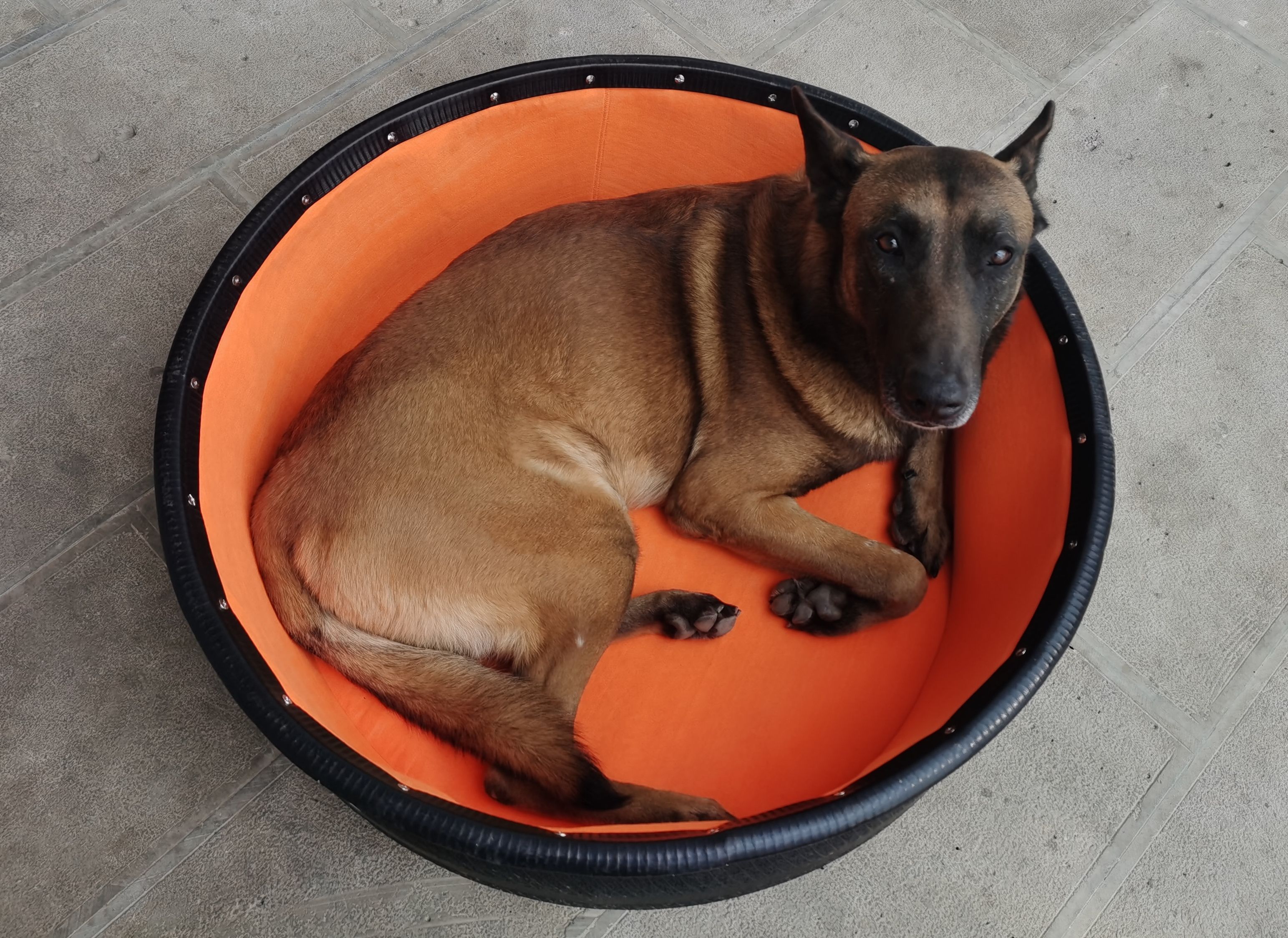 图为警犬“火爆”郑躺在赵聪设计的便携式工作犬专用床中