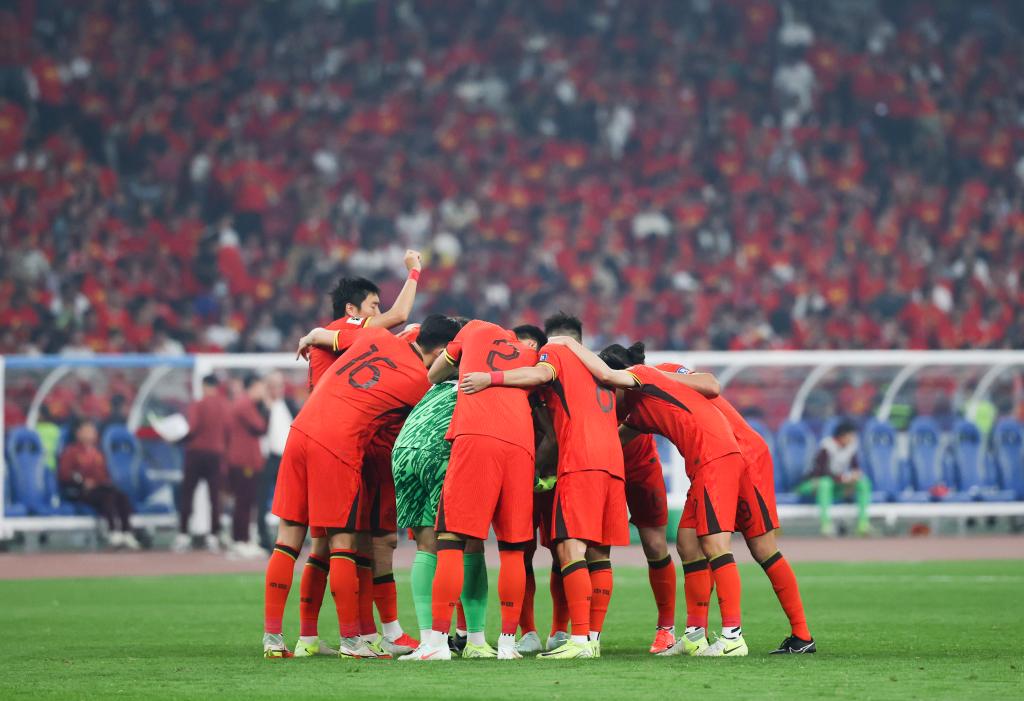 3月25日,中国队球员在2026年美加墨世界杯亚洲区预选赛18强赛C组第八轮比赛下半场开始前加油鼓劲。新华社记者 张晨 摄