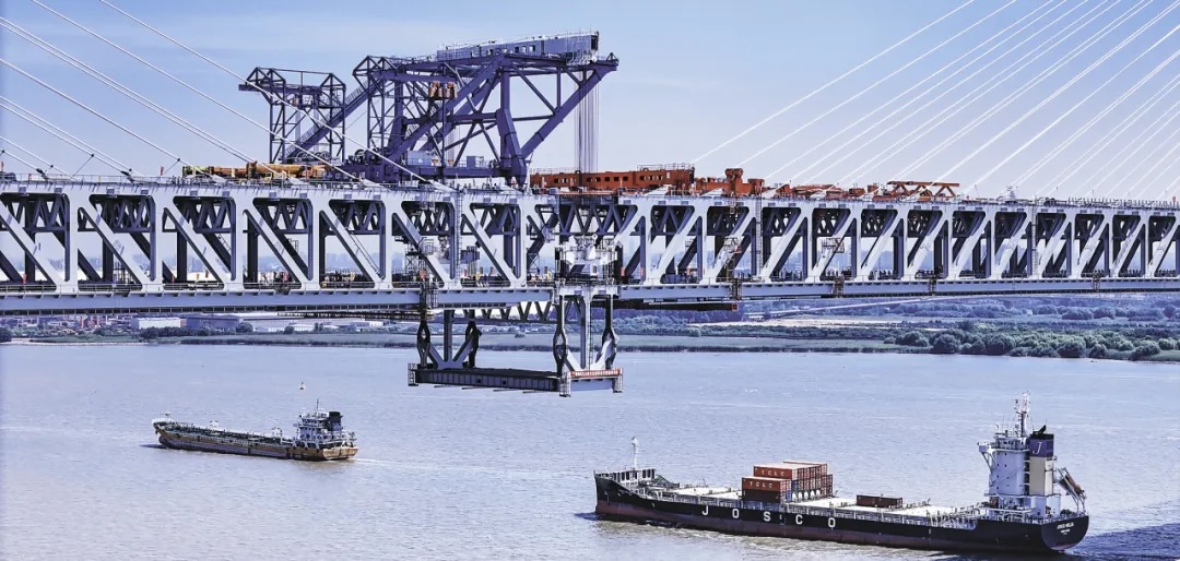 长江下游,常泰长江大桥横卧江面。由于桥梁主跨长、双层桥面重量大,全桥共有91个大节段,最大钢桁梁单体重量超1800吨,普通吊机无法正常工作。为了将这91个大“积木”拼接到位,全球最大吨位桥面吊机应运而生,它不仅“力气”大,能轻松吊起2000吨重物,还很“聪明”,能实时监控施工状态,使安装误差控制在5毫米内。