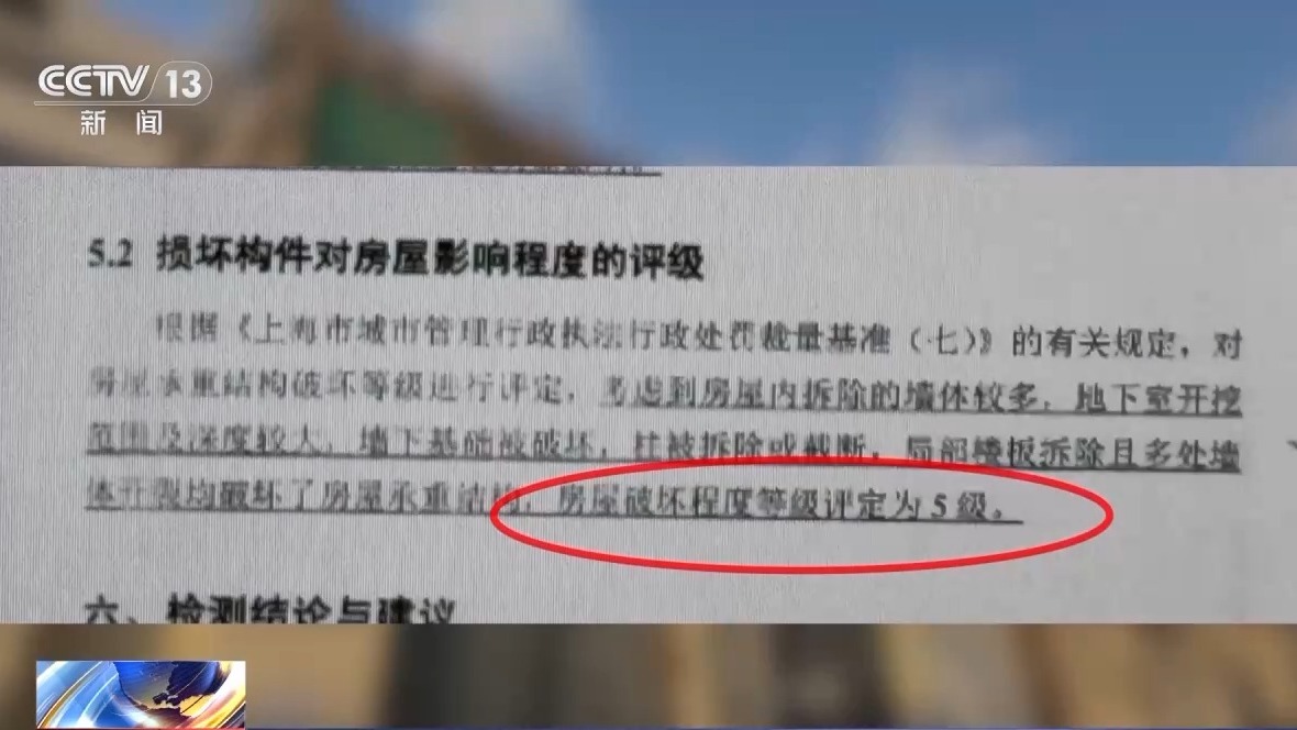 上海市虹口区人民检察院第二检察部主任黄春笑:这个房子的承重结构有多处被破坏,包括房屋开挖的地下室达到了2.8米深。在专业检测机构房屋评定等级风险等级评定上,达到了破坏的最高等级5级。
