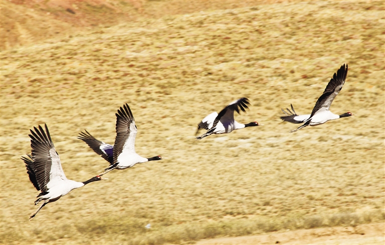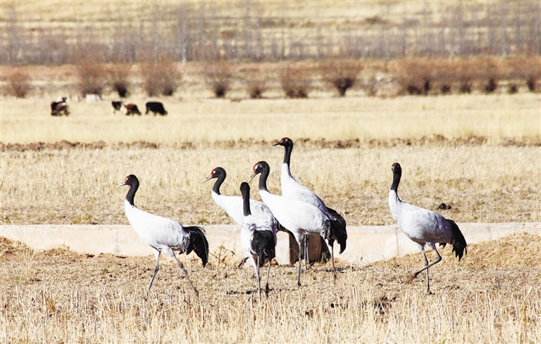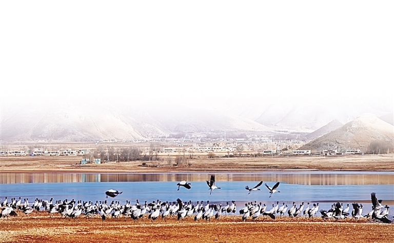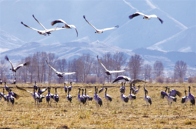 随着气候转暖,雅鲁藏布江中游河谷黑颈鹤国家级自然保护区喧闹起来,在此越冬的黑颈鹤开始春季迁徙。