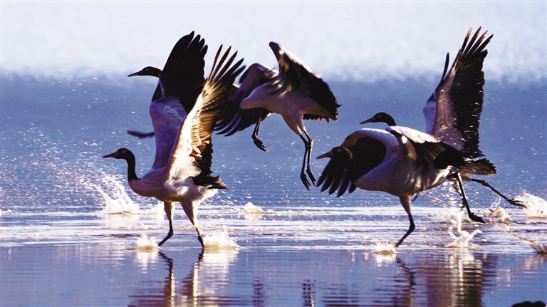 黑颈鹤,作为世界上唯一一种在高原繁殖和生活的鹤类,被人们称为“高原仙鹤” ,是国家一级重点保护野生动物。它们的主要栖息地在海拔2500米至5000米的高原草甸、沼泽地带。在西藏,它们的身影遍布西藏55个县域,主要选择高原河流、湖泊、沼泽和草甸等湿地来作为主要栖息地,将雅鲁藏布江中游河谷作为它们的越冬地。