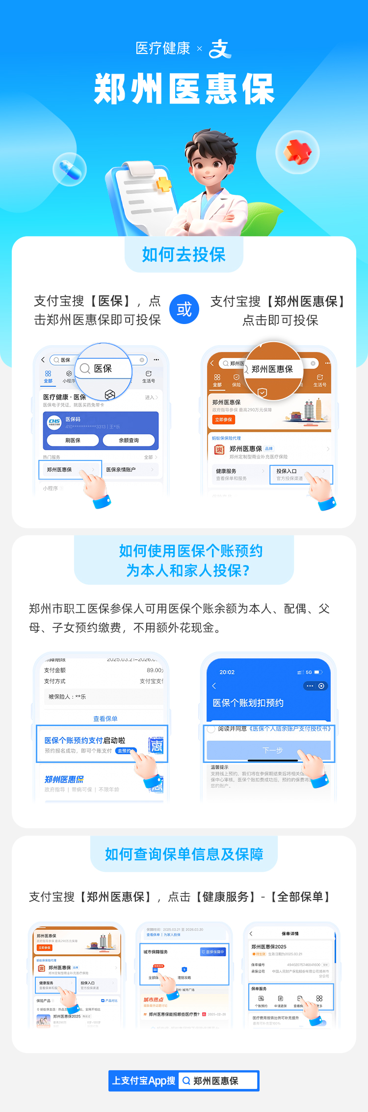 与往年一样,本年度的“郑州医惠保”依旧不限年龄、户籍及健康状况,只要是郑州市城镇职工医保参保人、郑州市城乡居民医保参保人、河南省省直职工医保参保人以及参加异地基本医疗保险的郑州“新市民”均可参保。市民可通过支付宝搜索“医保”或“郑州医惠保”办理。(“新市民”主要是指:因本人创业就业、子女上学、投靠子女等原因来到郑州常住的各类群体,包括但不限于进城务工人员、新就业大中专毕业生等)