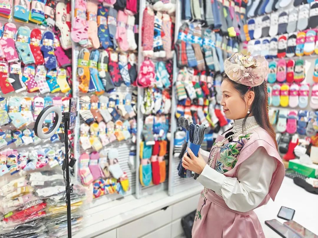 今年43岁的傅江燕是义乌本地人,从事外贸销售多年。这几年,她依托和丈夫一起经营的袜子店在网上做起跨境贸易。别看店铺面积不大,每年能卖出2000万双袜子,远销中东、南美、南非等地。