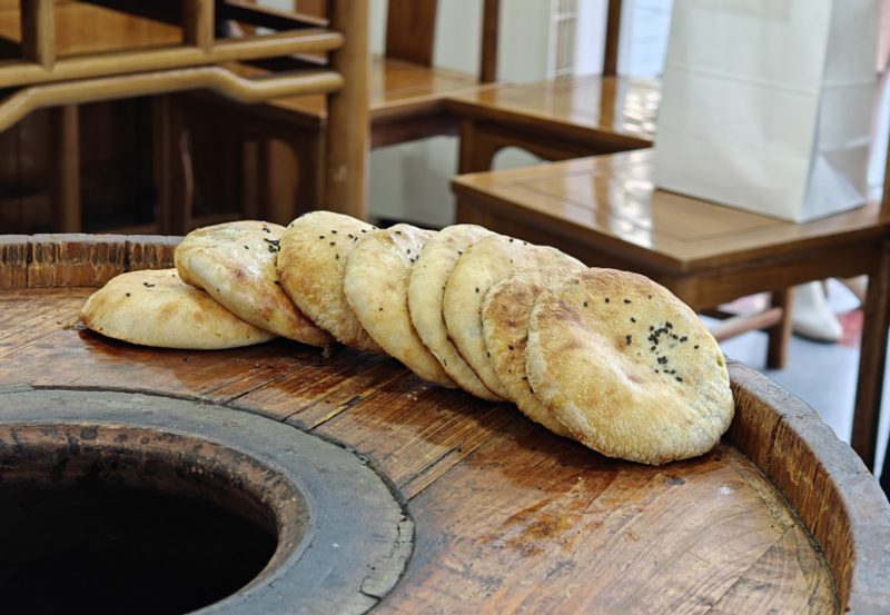 像赵师傅这样的“老把式”,下手“稳准狠”——估摸着烧饼桶芯壁的温度达到260℃—280℃左右,赵师傅将饼坯涂上水,迅速贴实炉壁,等上三五分钟,炉子里的饼香就往你的鼻孔里钻了!