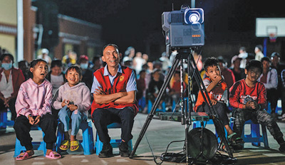 晚上7点半,夜幕降临。云南泸水市下橄榄村民小组的党员活动室小广场上,杨明金娴熟地把音响设备调试好,放起热场音乐,然后把幕布一点点仔细架起来。“要放电影啦——”现场的一名小朋友大喊了一声,人群渐渐朝音乐响起的地方聚集。不久,幕布上的光影开始闪烁。
