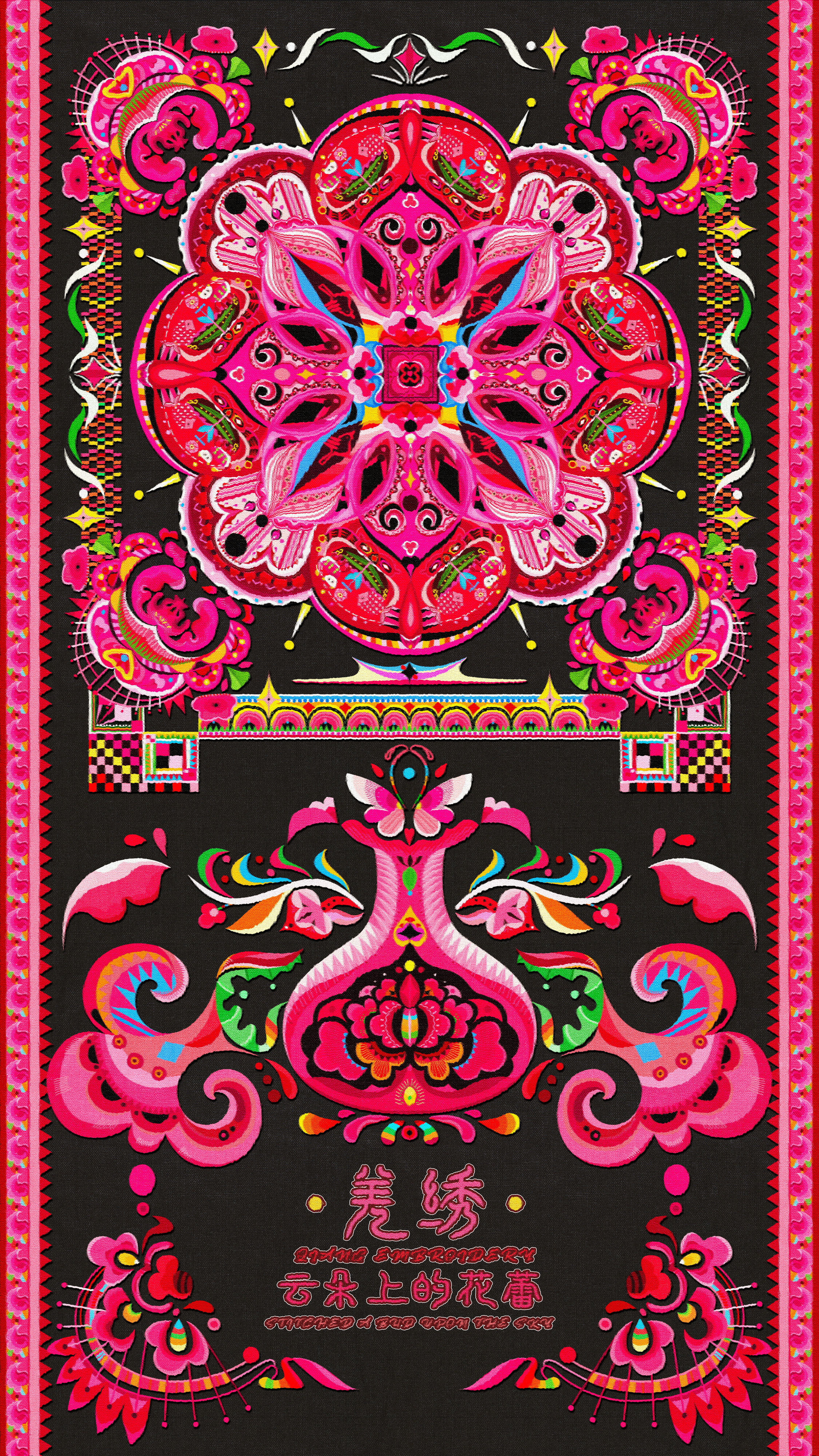 彝绣历史悠久,可追溯至三国前,堪称彝族文化传承的活化石。此幅彝绣创意纹样色彩浓烈、技法粗犷,融合了动物、植物、自然纹样,反映出人们的图腾崇拜和民族风情,承载着历史记忆、民俗风情和价值观念,成为记录民族独特魅力的生动方式。