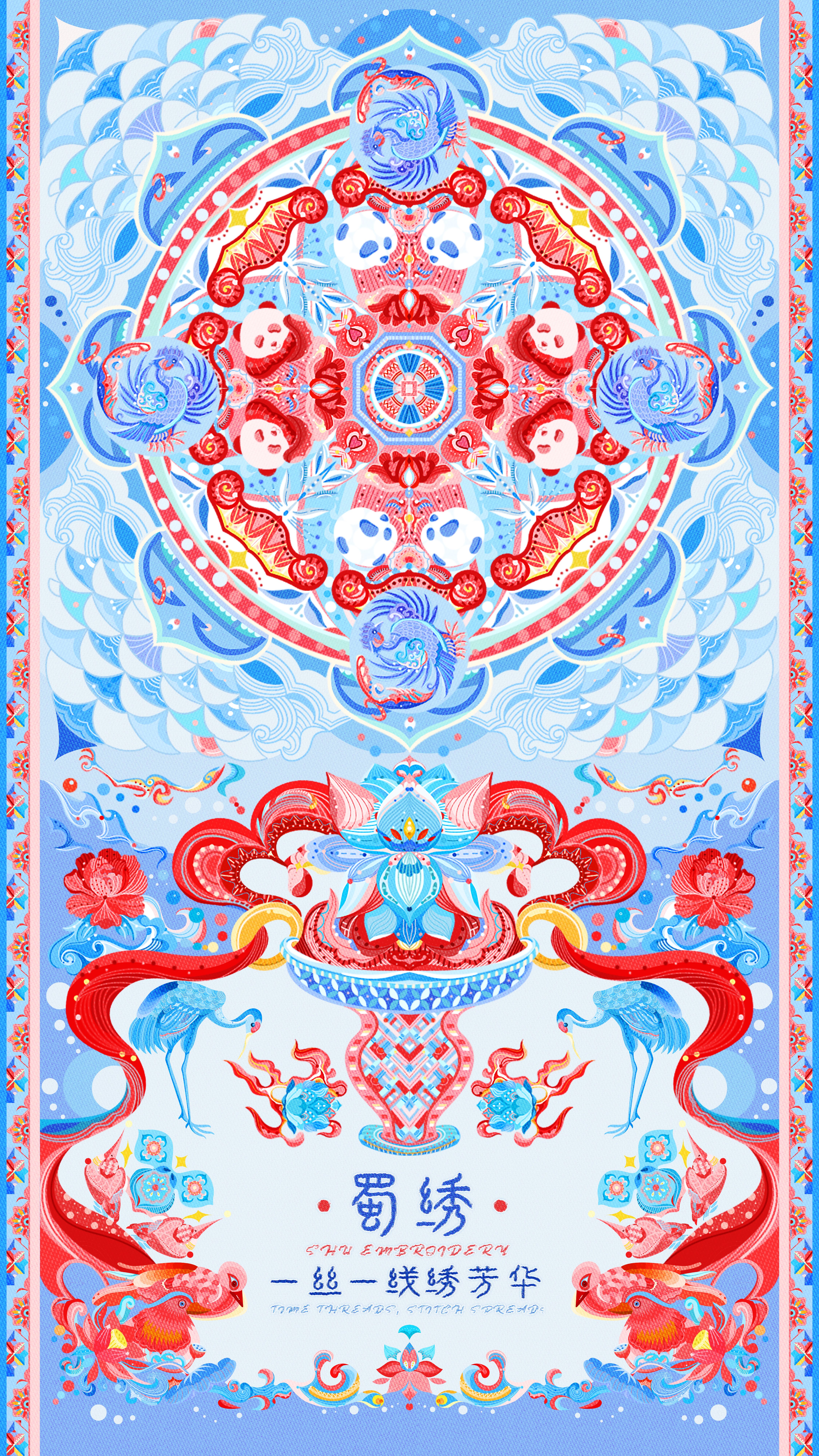 “以针代笔,以线为墨”,蜀绣匠人将巴山蜀水的灵秀和熊猫竹影的憨态悉数凝于锦缎之上。此幅蜀绣创意纹样以红蓝两色为基底,运用巴蜀特色熊猫纹、莲花纹和龙鳞纹,融入“混天绫”、“乾坤圈”等现代设计元素,使古老的技艺焕发新生,承载着巴蜀文化的灵秀与智慧。