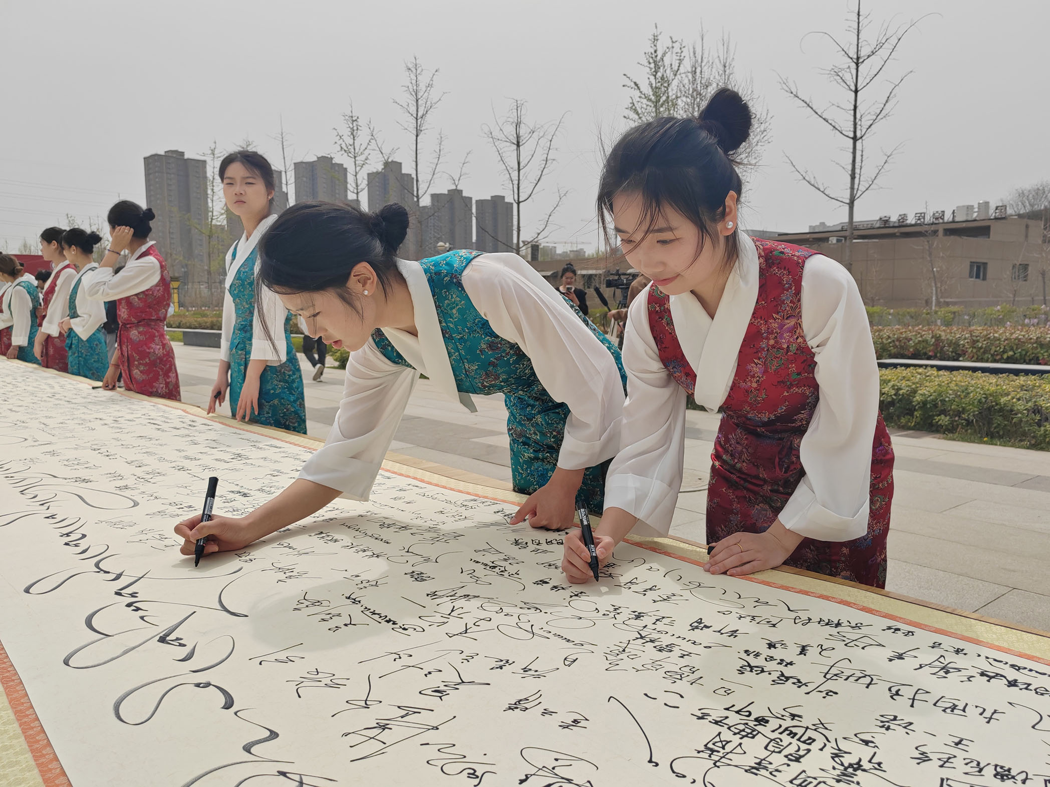 31日中午,秦汉校区谐园门前一时间聚满了学生,签名长卷前人头攒动,现场气氛如火如荼。大家满怀喜悦从志愿者手中接过签字笔,用汉藏双语在长卷上签下一个个姓名,绘就出一幅民族团结与时代奋进交融的壮美画卷。