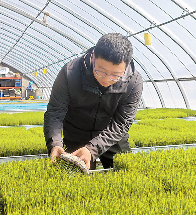 马巍查看秧苗在生物质育苗基质上的生长情况。 |