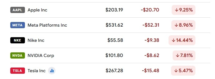 △3日收盘时,苹果、Meta、耐克、英伟达及特斯拉股价受重挫。