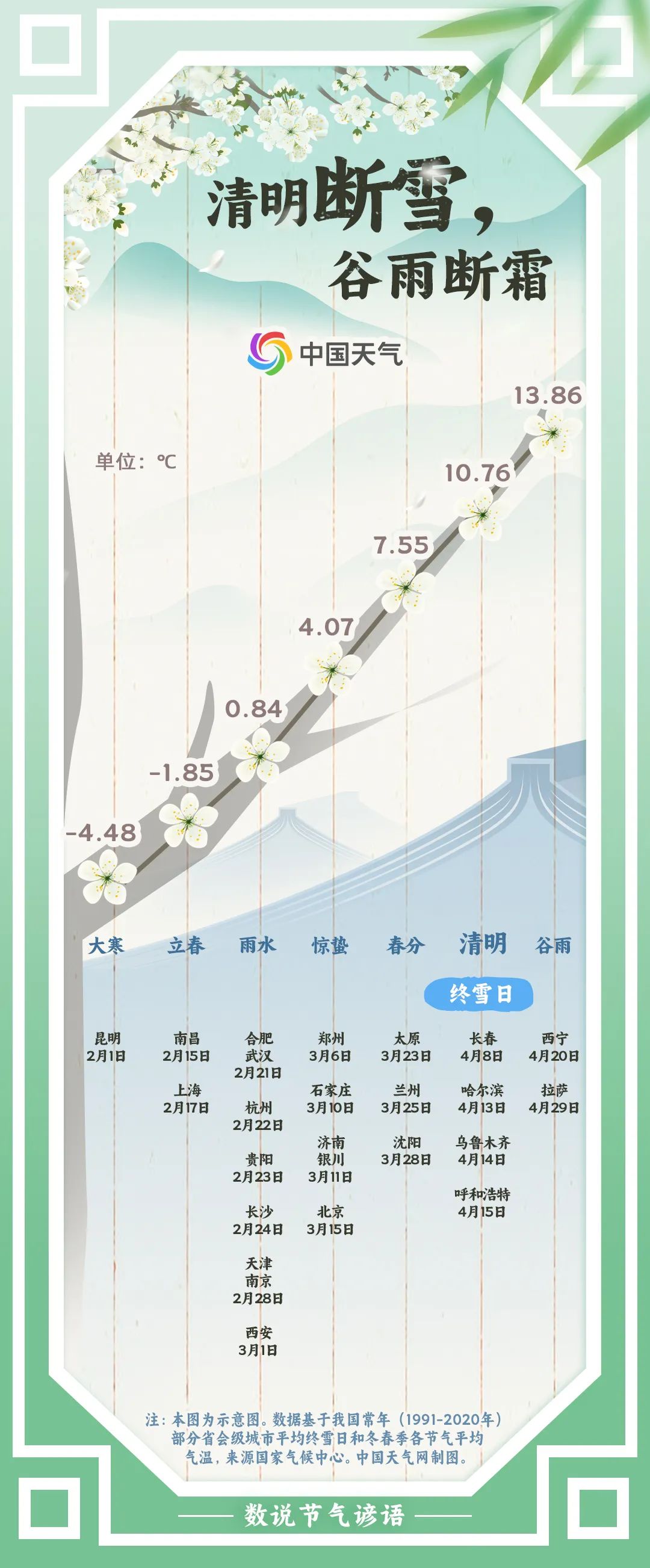 清明之后不再下雪了吗?对我国不少地区而言,“清明断雪”确实是成立的。中国天气网统计常年(1991至2020年)省会级城市平均终雪日发现,上海、杭州、北京、沈阳等19个城市均在清明节气之前就陆续迎来终雪日,长春、哈尔滨、乌鲁木齐、呼和浩特的终雪日则在清明节气期间,仅有西宁、拉萨的终雪日在谷雨节气。