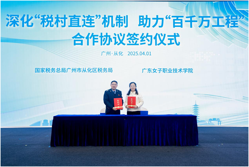 近日,国家税务总局广州市从化区税务局与广东女子职业技术学院签订“税惠赋能百千万 直连共筑振兴路”税校合作协议。双方以落实百校联百县助力“百县千镇万村高质量发展工程”行动(简称“双百行动”)为契机,共同打造“税村直连”示范样板,积极探索税校合作服务乡村新模式,为“百千万工程”注入税校协同新动能。