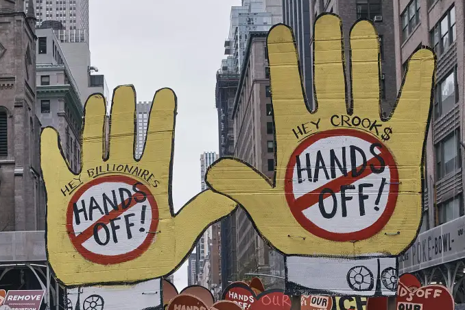 这一系列主题为“住手!”(Hands Off!)的抗议活动是美国总统特朗普就职以来美国爆发的最大规模集体抗议。特朗普政府削减劳工权利、破坏医保体系以及导致全民生活成本持续上涨的举措,令众多民众感到担忧和不满。