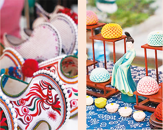 在非遗体验站点展示的彝绣、唐韵茶菓等文化产品。