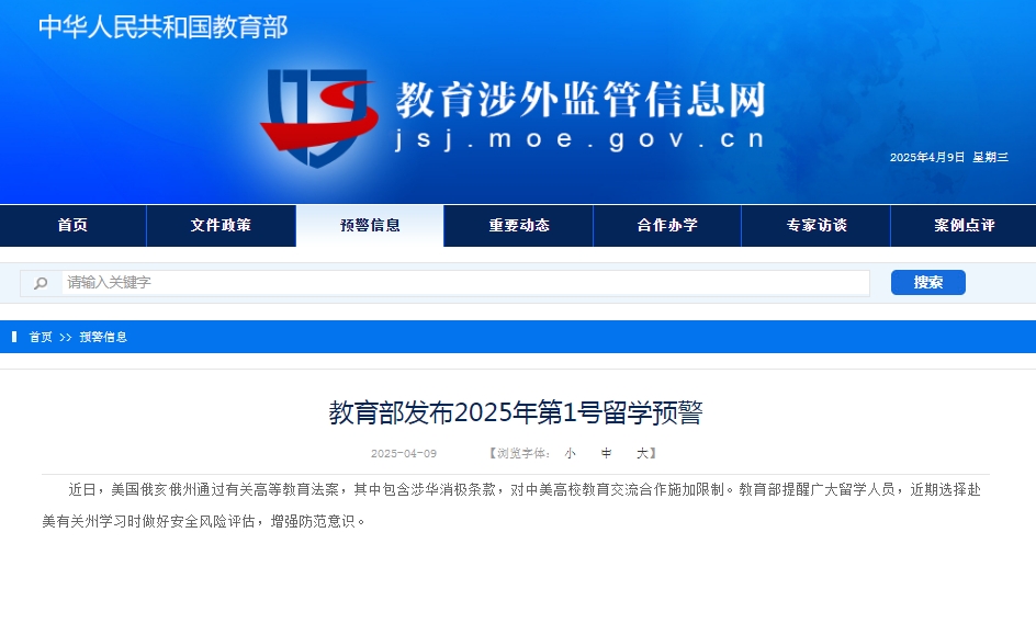 教育部发布留学预警。近日,美国俄亥俄州通过有关高等教育法案,其中包含涉华消极条款,对中美高校教育交流合作施加限制。教育部提醒广大留学人员,近期选择赴美有关州学习时做好安全风险评估,增强防范意识。