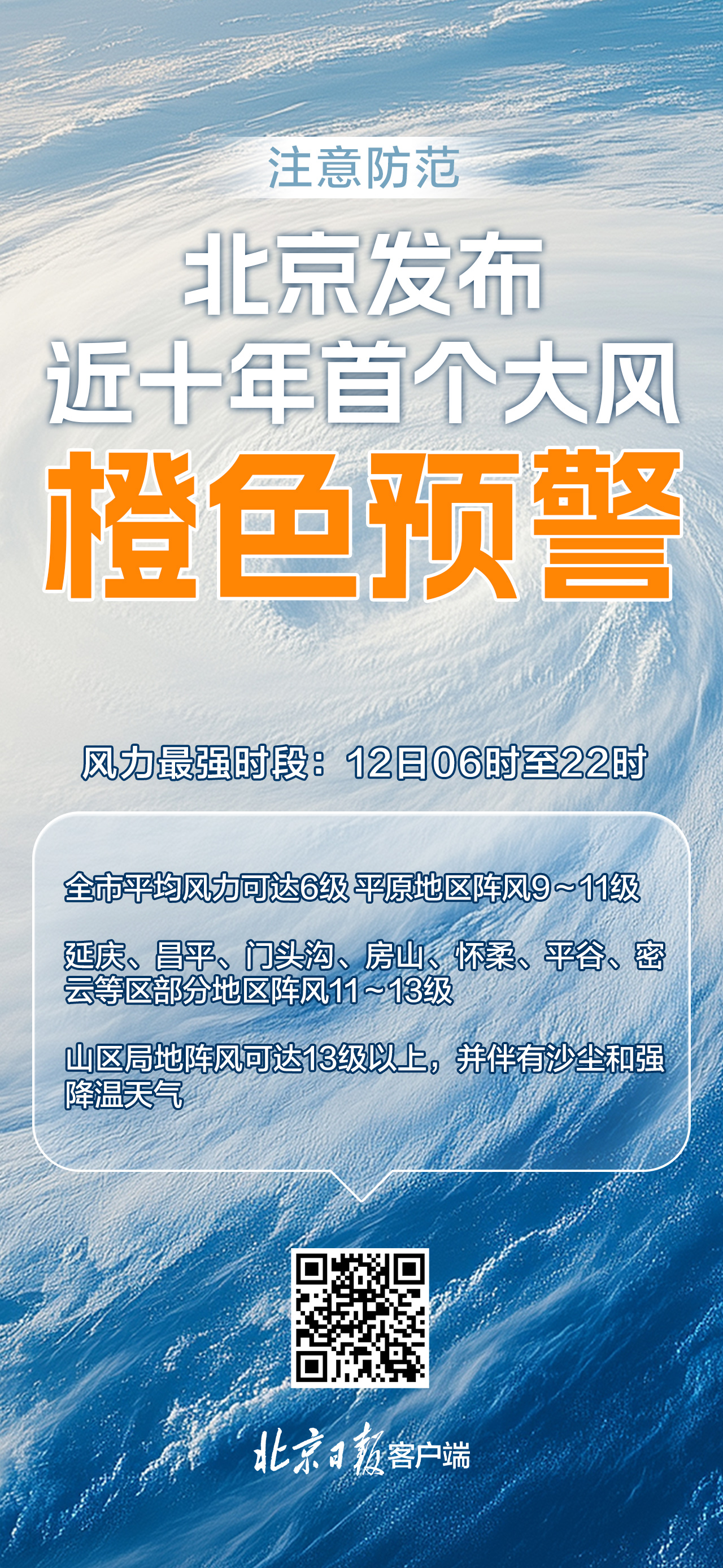 北京发布近十年首个全市大风橙色预警