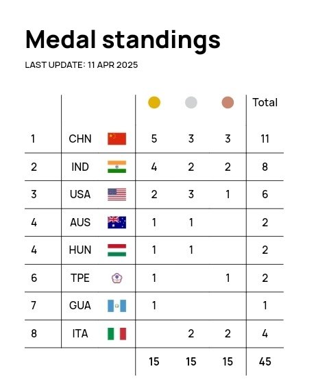 中国队最终以5金3银3铜的成绩排名本站赛事的奖牌榜首位。随后,队伍将奔赴秘鲁利马,参加将于4月15日举行的另一站世界杯分站赛。