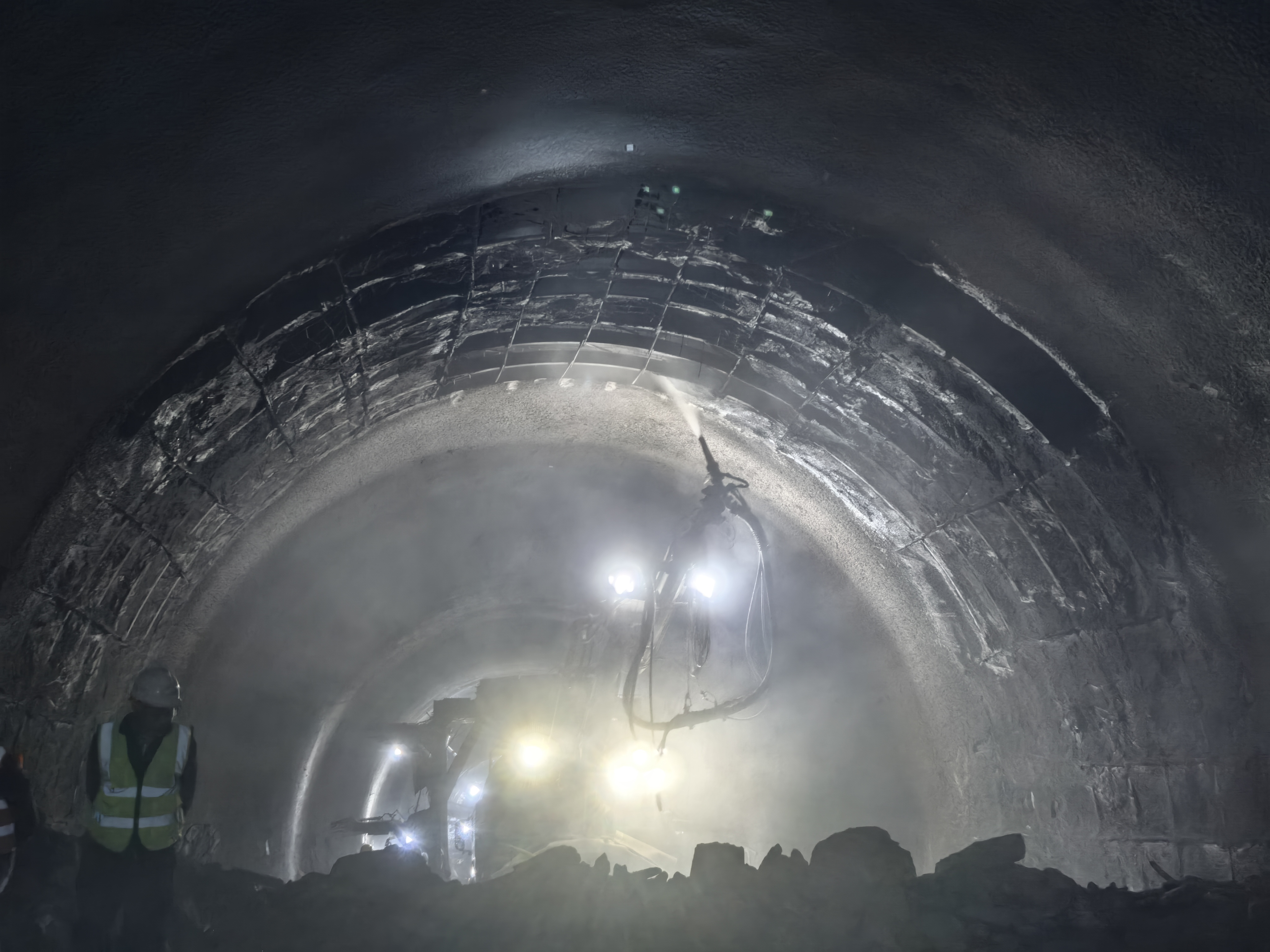 4月11日,贯通处,施工人员正在进行初期支护作业。记者 龚仕建摄