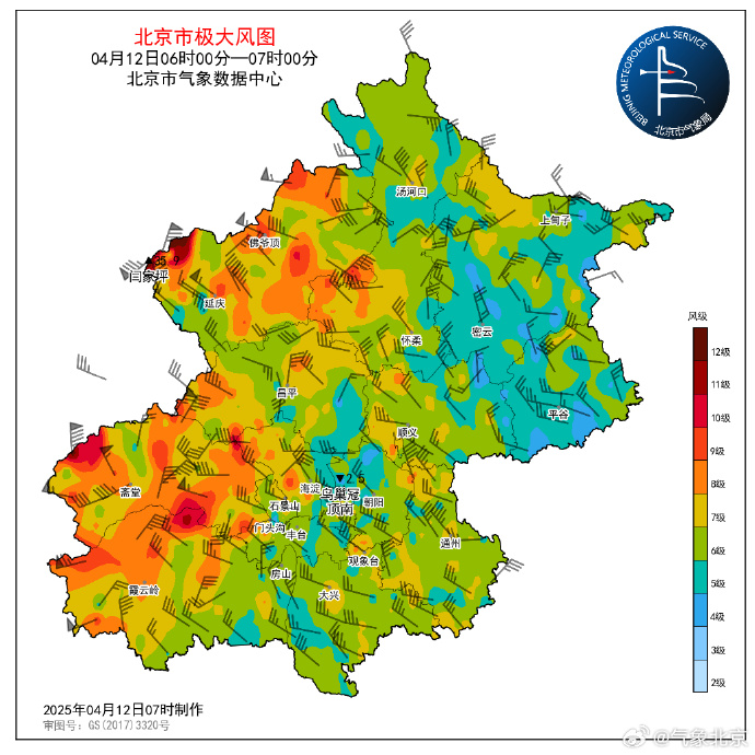 据@气象北京微博12日7时17分发布,天气实况:12日06-07时,北京市大部地区阵风6~9级,山区局地12级;全市最大阵风风速出现在延庆闫家坪35.9米/秒(12级);平原地区最大阵风风速出现在海淀闵庄22.4米/秒(9级)。